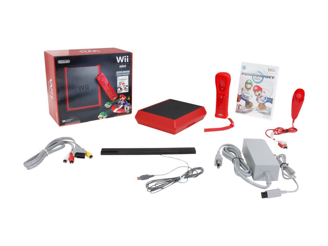 Includes Wii Mini Console, Wii Remote Plus Controller, Nunchuk Controller, Sensor Bar, Power Adapter & Composite Cable, & Mario Kart Wii game