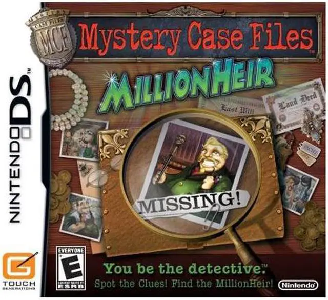 Mystery Case Files: MillionHeir uses the unique Nintendo DS interface to expand upon the seek-and-solve game play of the popular series from Big Fish Games. Players seek out cleverly hidden items in a multitude of painted scenes. Players progress through an interactive detective story investigating a cast of characters and uncovering new evidence to find the rightful heir to a million-dollar fortune. This new portable installment is available only for Nintendo DS. With interactive logic puzzles that use both the touch-screen interface and built-in microphone and include the first ever multiplayer mode for a Mystery Case Files game, Mystery Case Files: MillionHeir presents a new generation of seek-and-solve games for casual gamers and franchise fans.