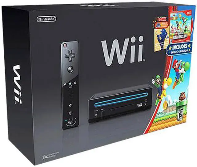 | Package Contents | Black Nintendo Wii console, black Wii Remote Plus, black Nunchuk, 2 AA batteries, AC adapter, New Super Mario Bros. Wii game and music CD. |