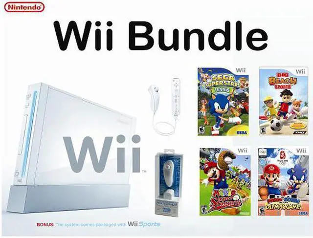 | Package Contents | Contains: Wii System Wii Sports Mario Super Sluggers Mario & Sonic at the Olympics Sega Superstars Tennis Big Beach Sports Additional Wireless Nunchuk |