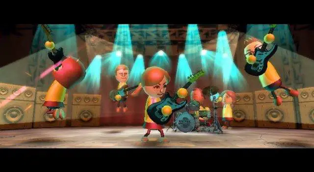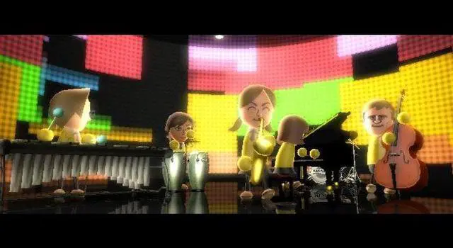 | Features | Wii Music includes many other modes besides the main band jams, including several musical games and an enhanced video playback mode for recorded jams. Play it again: Use the playback mode to see your jam recordings brought to life with dramatic camera angles. Pick up the baton: Command an orchestra in the conducting game where you'll wave the Wii Remote controller like a conductor's baton to lead a Mii orchestra through orchestrated music. Make them play quickly, slowly, strongly or gently. Ring a bell? Play a handbells game where you'll swing your Wii Remote and Nunchuk controllers to play your two handbells as part of a larger ensemble. Everyone on the team has a job to do: Play one of your notes only when the tune demands it. An ear for music: Take a tone quiz that tests your musical ear by giving you challenges, like putting note-playing Miis in order from lowest to highest pitch. Bang the drum: Play a virtual drum set in the drumming mode, the one mode in Wii Music that also uses the Wii Balance Board accessory (sold with Wii Fit). You'll use the Wii Remote and Nunchuk controllers as drumsticks, and place both feet on the Wii Balance Board—which work as virtual pedals for the bass drum and hi-hat cymbal. |