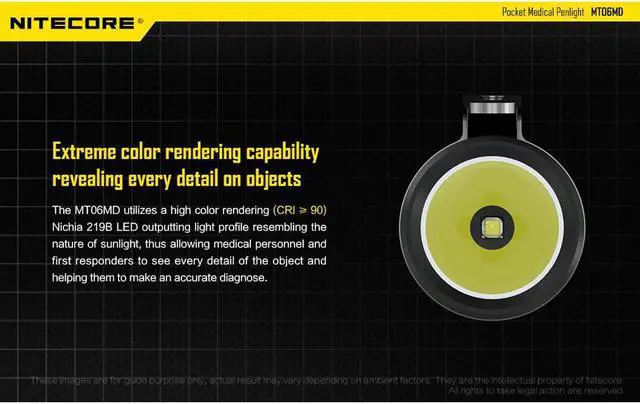 DESIGNED FOR MEDICAL PERSONNEL - The Nitecore MT06MD is an upgrade to the MT06 designed for doctors, nurses, EMTs, and other first responders and is photobiologically safe for use during pupil examination. IMPROVED DIAGNOSTIC TOOL - Equipped with a Nichia 219B LED, the MT06MD has a diffused output up to 180 lumens with a CRI>90 rating for enhanced color rendering to improve injury diagnosis and inspection with an accurate appearance of color. SAFE FOR EYES - With a low 4 lumen output, the MT06MD produces a floody, diffused beam rated RG0 for photobiological safety standards and can be safely directed at a patient's pupils without a concern for blue-light hazards.