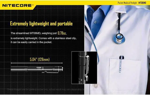 EASY TO USE & LIGHTWEIGHT - Operate the MT06MD with one-hand easily using the reverse-click tail switch and intuitive UI. At less than an ounce in weight, the MT06MD can be everyday carried by EMTs and medical professionals - the sturdy, stainless steel pocket clip will keep it snug and secure. COMPLETE PACKAGE - Includes a Nitecore MT06MD Flashlight and a Lumen Tactical 45 lumen keychain, a lightweight light easily kept on hand.