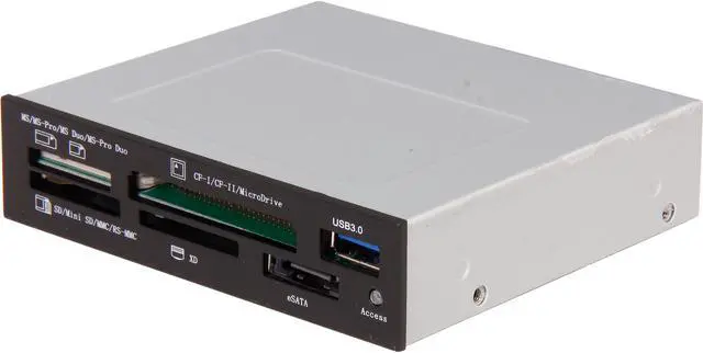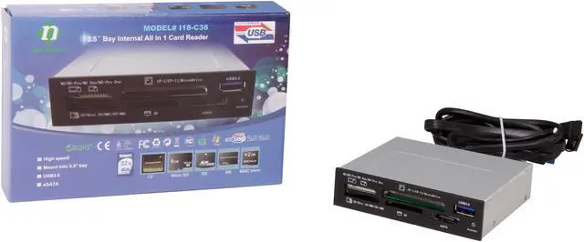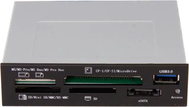 | Features | Support the latest High Speed / High Capacity Flash Memory Card Up to 32GB (SDHC 2.0 Compliance) Support SuperSpeed USB 3.0 X 1 port Support the latest flash card specification: CF 4.0 (DMA mode), SD1.1/2.0 (SDHC), MMC4.1/4.2, MSPro parallel mode (4-bit), xD 1.2 Support all e-SATA External Hard Drive Extra USB 2.0 port Internal design fitting into 3.5" drive bay to save the desktop space. Supports Hot-Swapping and Plug and Play function. Support slot-to-slot read/write operation USB Bus powered; no external power required. Support USB V2.0 specification and USB Device Class Definition for Mass Storage, Bulk-Transport Support Win ME/2000/XP/Vista/Win 7 & 8, Mac OS X/ V9.2 or higher Driverless All internal cable with direct connection to motherboard onboard port |