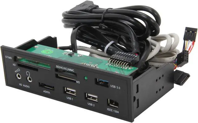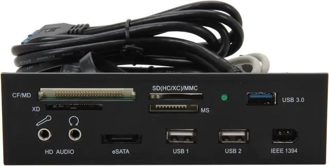 | Features | Support the latest High Speed / Extra Capacity Flash Memory Card Up to 2TB (SDHC 2.0 / SDXC Compliance) All-in-1 4 card slots card reader and writes CF; MD; SDHX; SDXC; MMC; xD; MS Memory Cards Support USB 3.0 x 1 and USB 2.0 X 2 ports (Internal header connected to onboard USB 2.0/3.0 port) Support High Definition & AC97 Front Audio (onboard port required) Support the latest flash card specification: CF 4.0 (DMA mode), SD1.1/2.0 (SDHC/SDXC), MMC4.1/4.2, MSPro parallel mode (4-bit), xD 1.2 Support all e-SATA External Hard Drive Internal design fitting into 5.25" drive bay to save the desktop space. Supports Hot-Swapping and Plug and Play function. Support slot-to-slot read/write operation USB Bus powered; no external power required. Support USB V2.0 & V3.0 specification and USB Device Class Definition for Mass Storage, Bulk-Transport Support Win ME/2000/XP/Vista/Win 7, Mac OS X/ V9.2 or higher Driverless All internal cable with direct connection to motherboard onboard port |