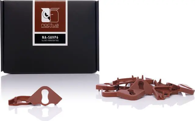 The NA-SAVP6 is a fan accessory set consisting of 16 brown NA-AVP6 anti-vibration pads for up to 2 compatible 200mm fans (see compatibility info). Made from extra-soft silicone, the NA-AVP6 pads minimise the transmission of minute vibrations while maintaining full compatibility with standard fan screws and most other mounting systems. At the same time, the original brown version is ideal for adding subtle brown accents to Noctua's chromax line fans.