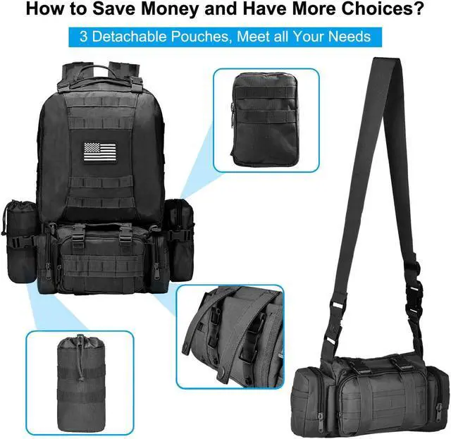 - One front detachable bag which you can us as a tactical crossbody bag separately.