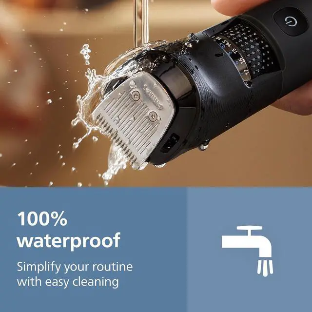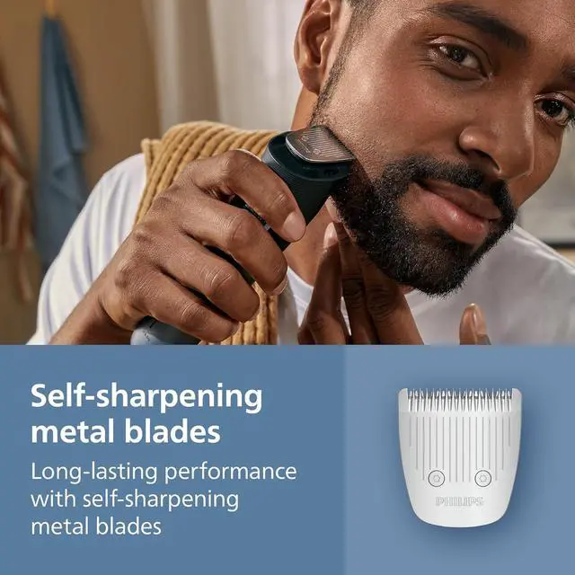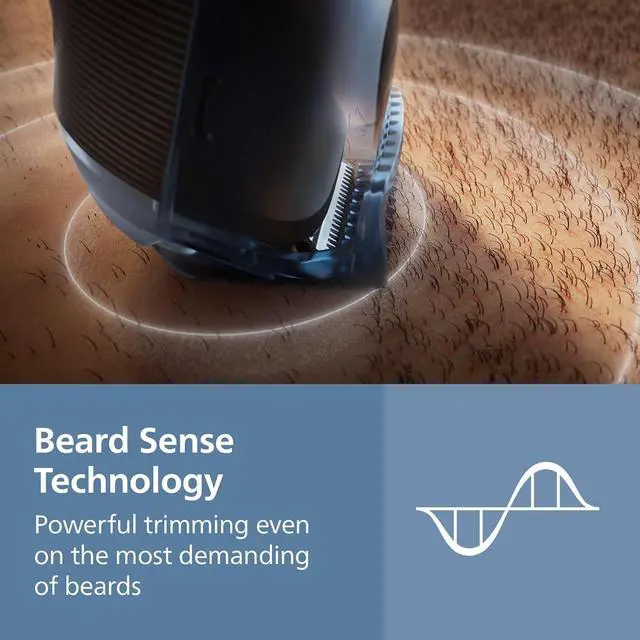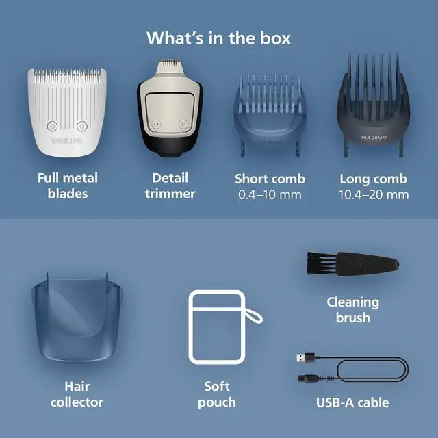 | Features | The Philips Norelco Beard Trimmer 5000 Series features metal beard trimming blades that deliver powerful precision & stay as sharp as day 1 with no blade oil required. Our beard styler has 40 length settings in 0.2 mm steps, helping you craft your facial hair as precisely as you need including 3-day stubble, short beard, or long beard looks. Attachable Lift&Trim combs and click-on detail trimmer capture stray hairs and add extra definition to your style Thanks to BeardSense technology, this Philips Norelco trimmer scans your beard density 125x per second to boost trimming power in denser areas, giving you the right power for the best result. The innovative beard hair mess collector efficiently catches up to 80% of trimmed hairs¹, giving you less hassle as you style your beard. Designed for comfort and control, the ergonomic trimmer grip with 360-degree Fine Line grip makes the device easy to hold and handle, allowing you to achieve your desired look. The face trimmer is 100% washable, so you can just rinse it under the tap and go, simplifying your grooming routine. Keep all your attachments in a small soft pouch for easy organization and travel. The durable, USB-A charged (power adaptor not included) lithium battery delivers up to 100 minutes of runtime with a 5-minute quick charge option³, ensuring a powerful, long-lasting beard trimming experience at home or while traveling. The Philips Norelco Beard Trimmer 5000 Series is a device that's built to last: this trimmer comes with a warranty of up to 5 years². ¹ Based on the mean subjective measure from a consumer test involving 76 users ² 2 years + 3 years warranty upon registration within 90 days on Philips.com ³ Quick charge option provides enough power for one trimming session |