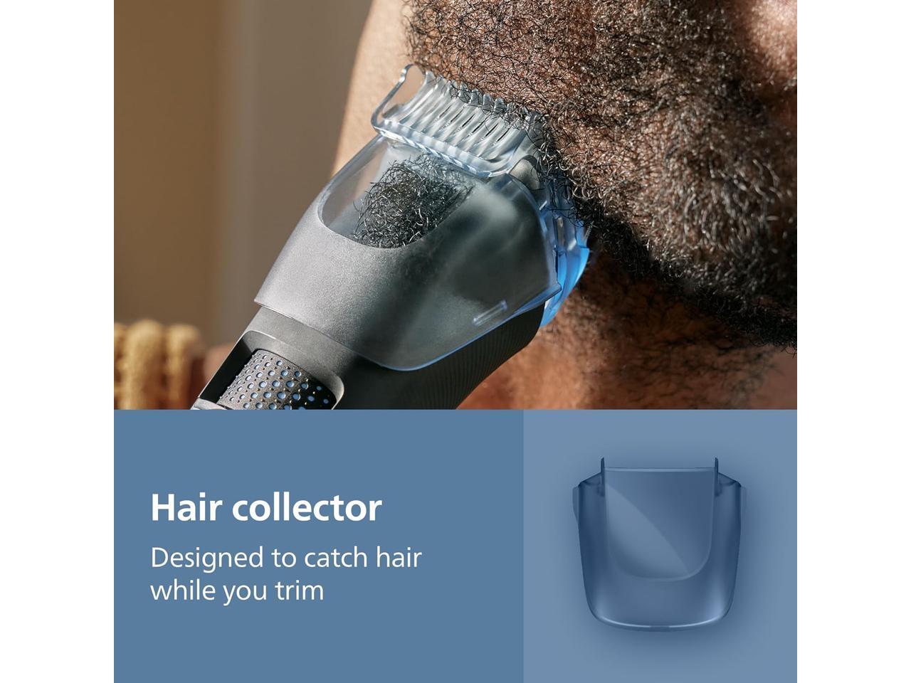 - CATCH UP TO 80% OF CUT HAIR¹ during your grooming routine with the facial hair mess collector which makes post-trim cleanup easier