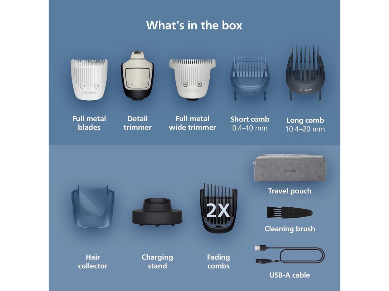 - BEARD FADING COMBS contour to create shades on both sides of your head & click-on wide T-blade and narrow trimmer heads add extra style definition