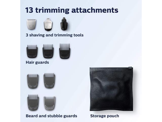 - 13 pieces for all of your grooming needs: Beard and stubble trimming and maintenance, precision trimmer allows exact placement for sharp lines, nose and ear trimmer taking care of unwanted hairs