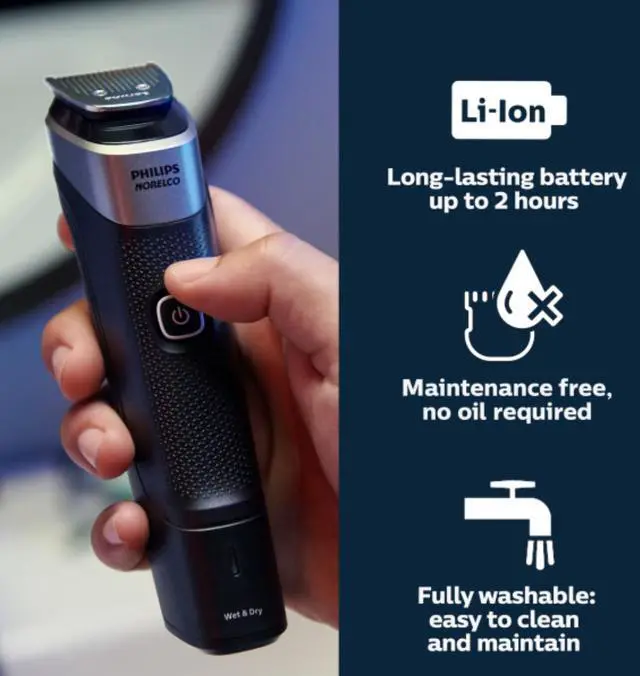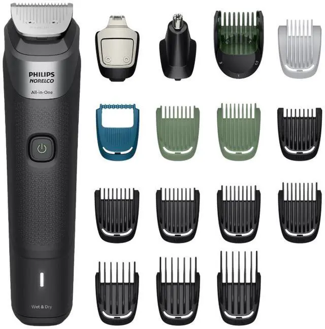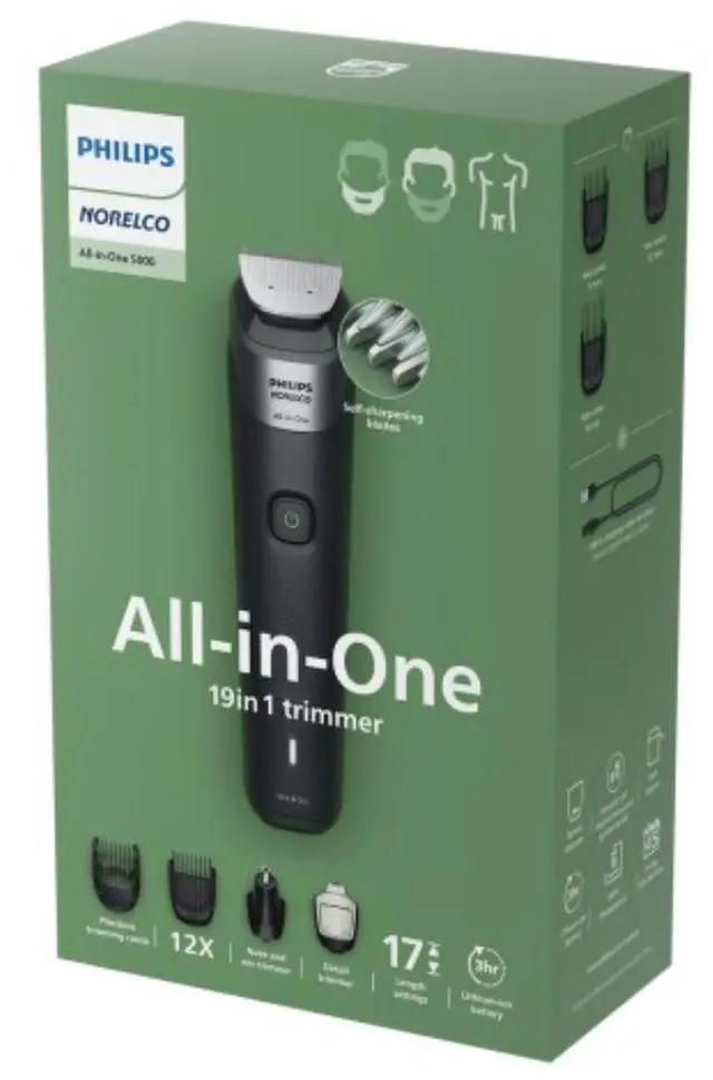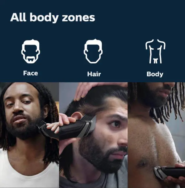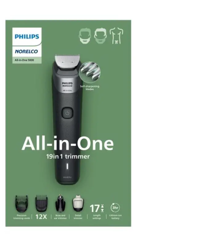 | Features | For face, hair and body Our All-in-One trimmer has 19 quality tools designed for face, head and body, including self-sharpening blades that stay as sharp as day 1, with no oil needed, for long-lasting performance 19 tools for all your grooming needs Our trimmer comes with 19 tools so you can trim and style your facial hair, clip your hair, and groom your body, conveniently covering all your grooming needs An even trim at your desired length for your ideal look Our precision comb, with length settings in 0.5 mm steps from 1 to 3 mm, delivers an even trim at the exact length you want for an ideal finish Maximum precision with long-lasting performance Self-sharpening steel blades deliver added strength for maximum precision as you trim, staying as sharp as day 1 with no blade oil required Add sharp and even definition to your final look The trimmer’s multi-comb set comes with 17 length settings from 0.5mm up to 16mm in precise 1mm increments, so you can style your beard long or short. The detail trimmer’s narrow design also gives added precision to create sharp lines and fine details, while the metal trimmer cleans your cheeks, chin and neck to get your beard exactly how you like it Trim body hair efficiently and with extra protection Efficiently trim your body hair with the click-on body comb and a uniquely designed comb to guard the skin of your sensitive areas from the blade as you trim, delivering extra gentleness Clip your hair, your way The trimmer’s multi-comb system allows you to choose length settings from 0.5mm to 16mm to easily maintain your hairstyle at home Keep unwanted nose and ear hair under control The All-in-One trimmer is designed to remove unwanted nose and ear hair gently and comfortably, helping you avoid nicks and cuts Powerful 6 week performance on a single charge Our durable lithium battery delivers up to 180 minutes of runtime with 5-minute quick charge option, for a powerful, continual trimming experience |