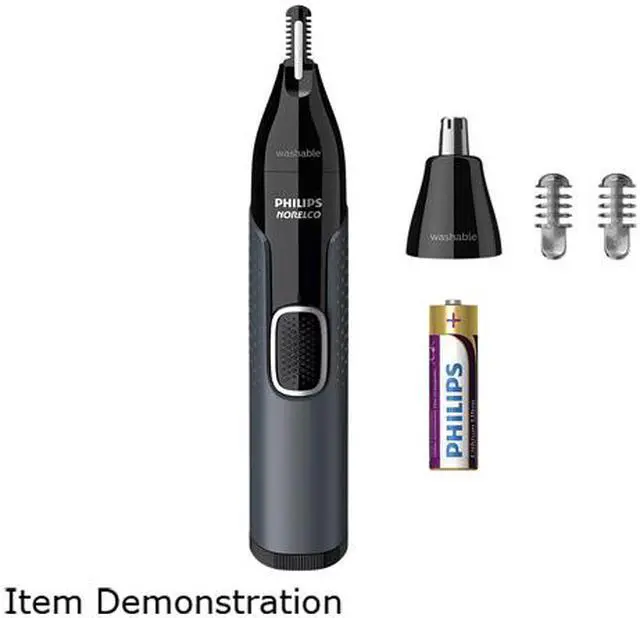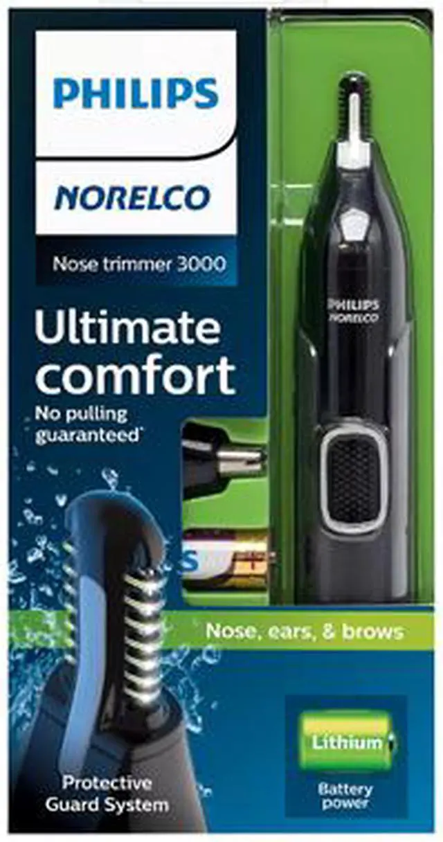 The Norelco Nose Trimmer 3000's Protective Guard System comfortably trims unwanted nose, ear and brow hair. No pulling guaranteed. Includes linear and rotary trimmers, a lithium battery and 2 eyebrow guards. Fully washable, easy to clean.