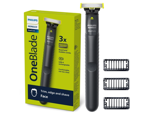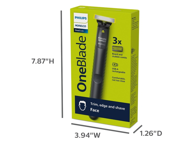 - What's in the Box: 1 OneBlade Handle, 1 Original Blade, 3 Stubble Combs (1, 3, 5mm), 1 USB-A Charging Cord (adapter not included), 1 Protective Cap