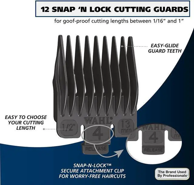 The guards contain easy-glide teeth for no-snag goof-proof haircutting and large easy to see comb sizes for easy identification. The snap-n-lock attachment clip securely fastens to the clipper blade.