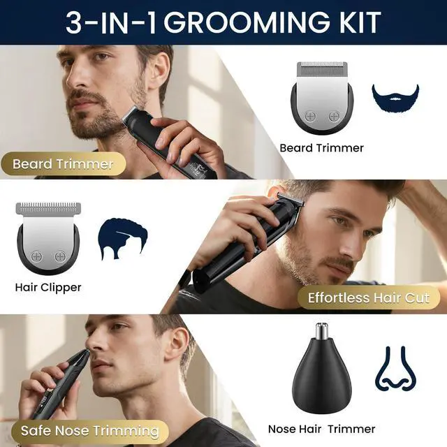 3-in-1 Men's Grooming Kit: This beard trimmer kit comes with 3 heads (beard, sideburns, nose hair) and multiple guard combs ranging from 1mm to 19mm, including ear guides, to effortlessly handle all facial, head, and body hair trimming needs. Everything stores neatly in the included travel pouch, which also contains a cleaning brush, lubricating oil, and a Type-C charging cable.