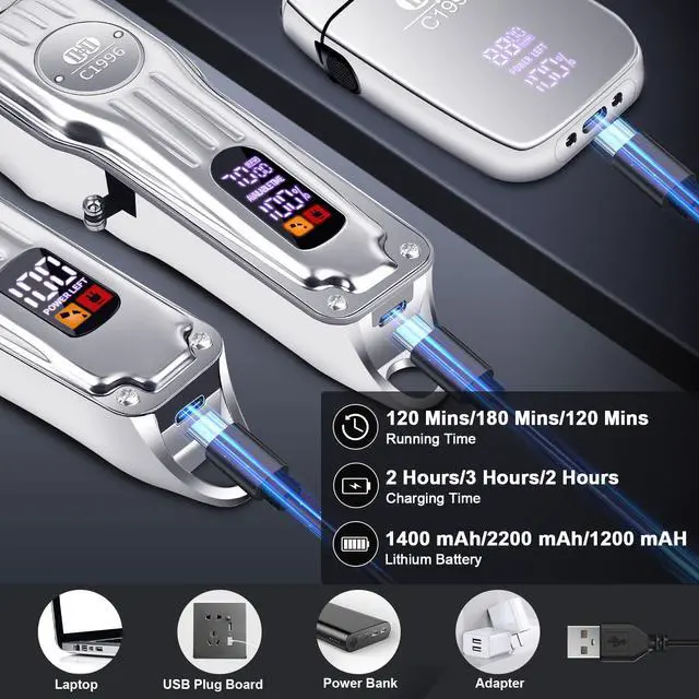 - Cordless Clippers & Trimmers & Shavers: ?2200mAh battery rechargeable hair clippers can cordless use over 3 hours after full charge. ?1400mAh hair trimmer can cordless use over 2 hours after full charge. ?1200mAh Electric Shavers can cordless use over 2 hours after full charge. USB Charging Cable can charge anytime anywhere by connecting with any type USB interface adapter (Like phone charging adapter, laptop, usb plug board, power bank...), Designed for international use, easy to use for business trip or travel.