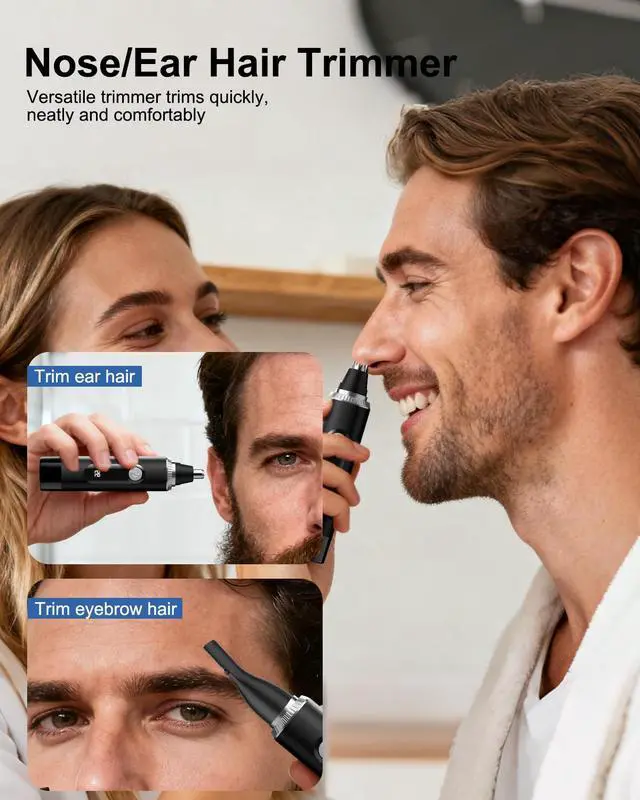 The box includes the main trimmer unit,eyebrow trimmer, a protective head cap, a USB charging cable, and a small cleaning brush for maintenance. Everything you need is ready to use.