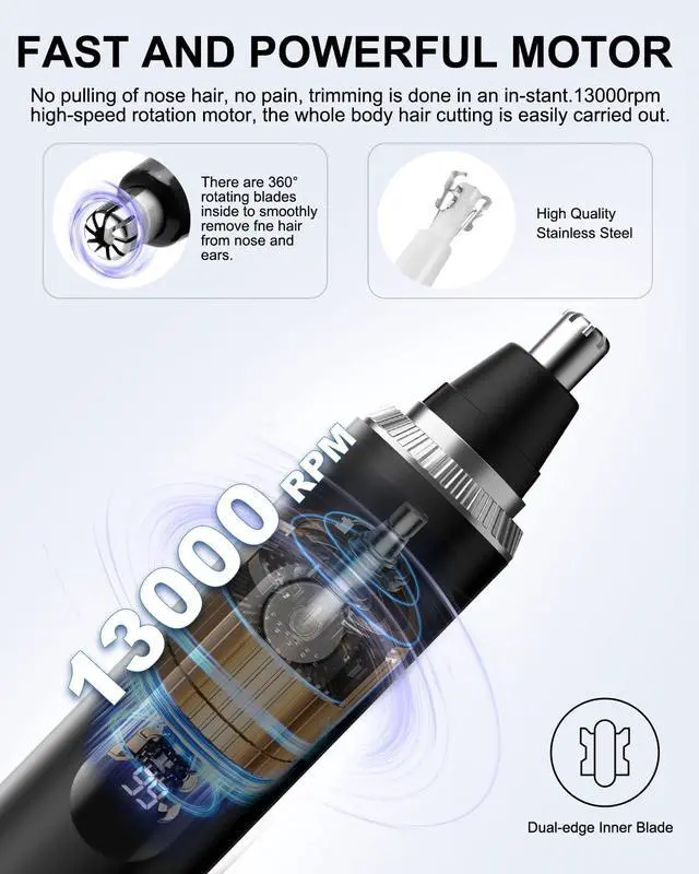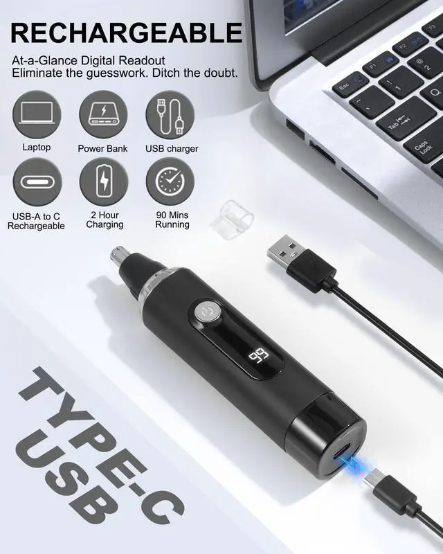 Our nose and ear eyebrow trimmer hair trimmer is designed with a long-lasting rechargeable battery. Rechargeable battery 1.5 hourfast charge, continue to workfor 90 minutes. Features a Type-C universal charger.