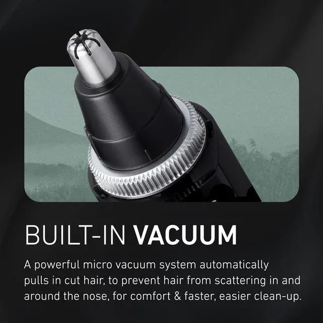 Advanced Micro-Vacuum System: Powerful vacuum collects cut hair for less mess while trimming; run under water to flush out clippings with advanced vortex cleaning system; nose trimmer body rinses clean