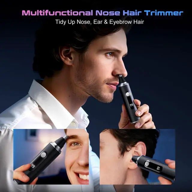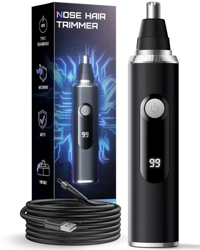 Nose Hair Trimmer for Men and Women, USB Rechargeable Electric Facial and Ear Hair Remover with LED Display, Dual-Edge Blades for Smooth, Painless Eyebrow Grooming (Black)