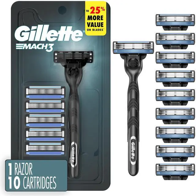 Mach3 Shaving Razor for Men, 1 Razor Gillette 3-Blade Handle for Mens Grooming, 10 Razor Blade Refills, Lubrication Strip