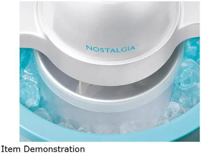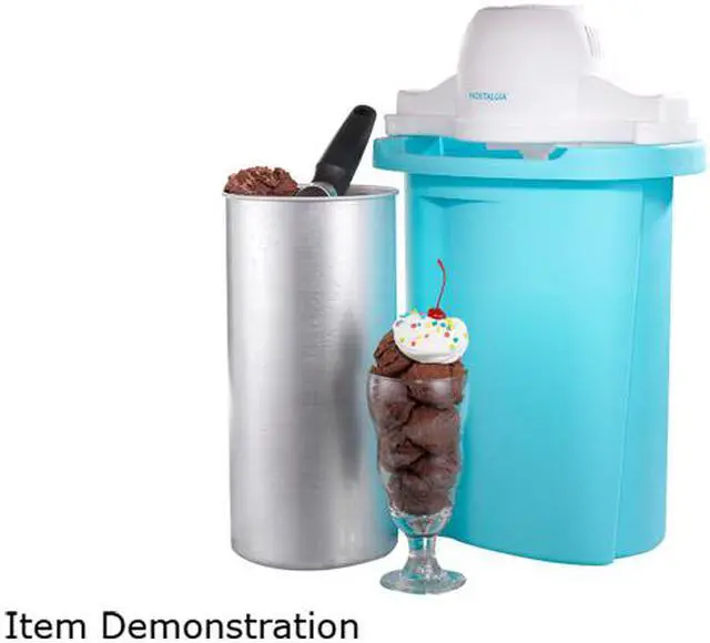 The Nostalgia ICMP600BLUE 6-Quart Electric Ice Cream Maker is a fast and easy way to make 6-quarts of ice cream- frozen yogurt- or gelato. Featuring a locking motor mount- easy to clean plastic bucket and 6-quart aluminum canister. Simply add your ingredients into the aluminum canister and place in the middle of the bucket- layer with ice and salt and let the electric motor do the rest. Soon you will have wonderful homemade ice cream. Customize each recipe by adding extras- like strawberry preserves- cookie dough- candy pieces and more. When done- use the included lid and lid cap to store leftover ice cream in the freezer.