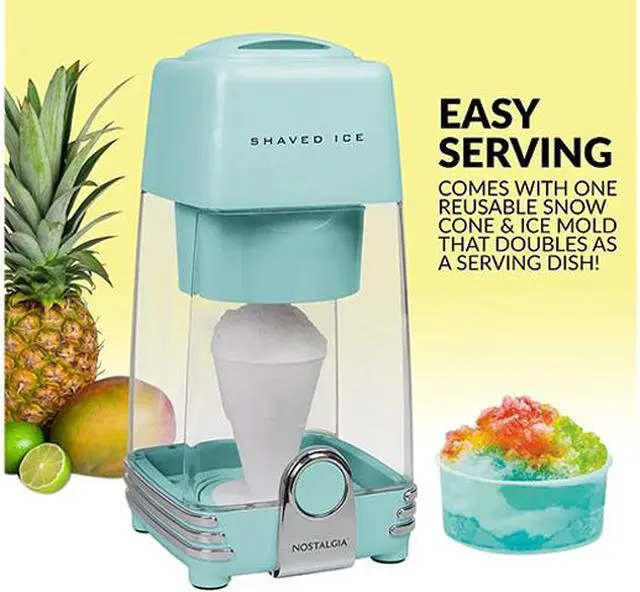 | Features | Nostalgia IS2AQ Electric Shaved Ice & Snow Cone Maker makes a variety of cool, refreshing treats with ease. It features stainless steel cutting blades that work quickly to create perfect snow-like ice. Watch every treat being made through the 360° clear viewing chamber and allow the drip tray to catch anything left behind. Use the included ice mold or standard ice to create a multitude of frozen treats. PARTY PLEASER: Easy way to make delicious fluffy snow cones - making this perfect for birthday parties and other big events NOSTALGIA SNOW CONE KITS: Unit works perfectly with all nostalgia snow cone kits - try the snow cone kit (SCK3) snow cone syrups (SCS160) or the straws and cups (SCSTRAWCUP20) STAINLESS STEEL CUTTING BLADES: The precision-cut stainless steel cutting blades equipped with this machine work quickly and efficiently to shave ice cubes into delicious fluffy snow-like ice 360° VIEWS: With a chamber that's clear from all views it's easy to shave ice and watch it pile up from any angle STANDARD ICE CUBES: Fill the shaving cage with 10 regular-sized ice cubes for best results ICE MOLD: Ice mold will produce fluffier snow and will make approximately two cups each use mold can also be used as a serving bowl for shaved ice PERFECT SIZE: This unit is the perfect size to fit on a kitchen countertop or a small side table making it easy to serve snow cones wherever you go INCLUDED: Includes one reusable plastic snow cone so you can easily serve snow cones while the drip tray catches unwanted messes |