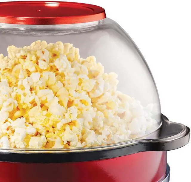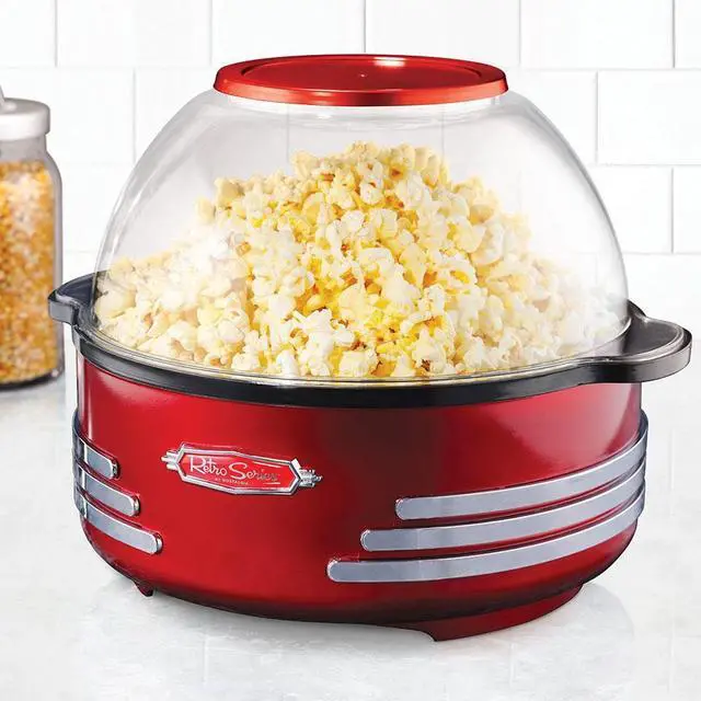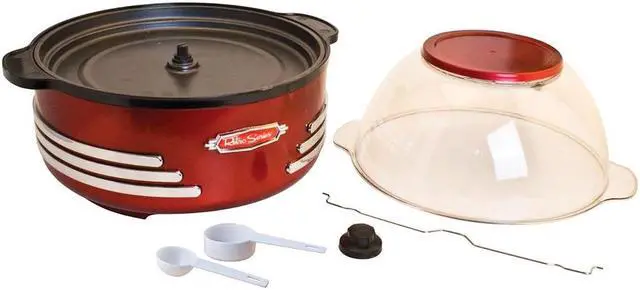 | Features | The Nostalgia Electrics SP300RETRORED Retro Series Stirring Popcorn Maker is fun and easy to use. It's a popcorn maker and serving bowl in one! Simply add kernels and flip the switch. In about five minutes, replace the lid, turn unit upside-down and you'll have a bowl full of delicious popcorn. The included measuring spoon allows you to add the perfect amount of kernels for each batch, while the stirrer inside helps prevent popcorn from burning. Add oil, butter or salt to enhance the flavor. Also works great for making kettle corn or roasting nuts. Built-in stirring system Ventilation slots Serving bucket Cool touch handles Built-in measuring cap |
