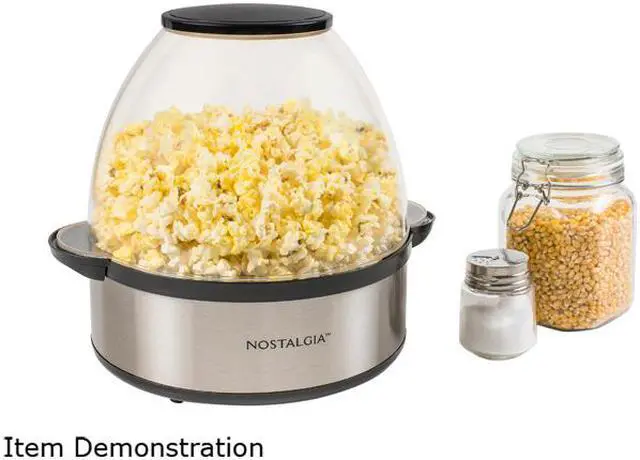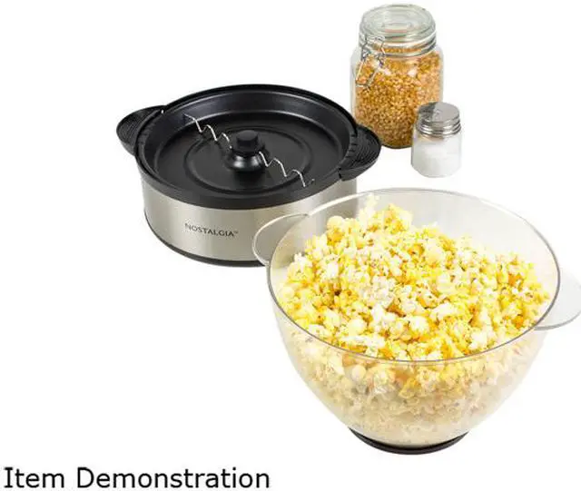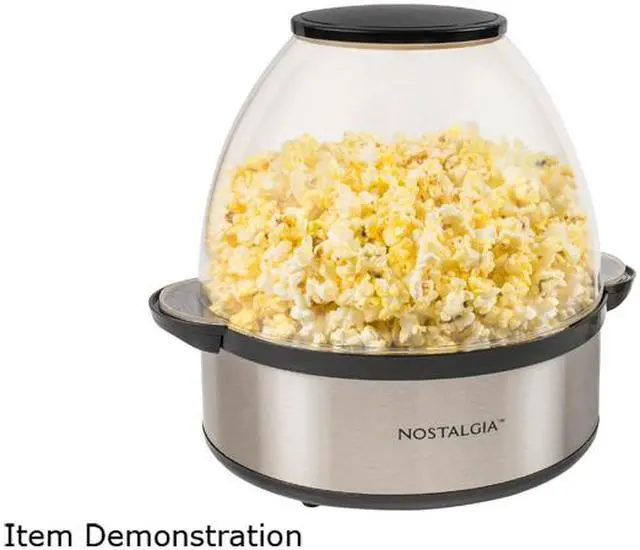 | Features | 24-Cups Pops up to 24 cups of popcorn per batch in about 3 minutes! Nostalgia Popcorn Kits Perfect for use with all Nostalgia Popcorn Kits! (Theater Hot Air & Kettle Kit-KPK400, 4-ounce Premium Popcorn Pack-KPP424, PPB600-Reusable Popcorn Bowls) Halogen Heating Quick-heat halogen technology allows popcorn to pop 30% faster than traditional stirring popcorn makers - no preheating needed! Flip and Eat Easily removable non-stick cooking plate flips with the bowl for easy serving Pop More Kernels Motorized stirring rod evenly distributes kernels and reverses when needed for better popping performance Always Fresh and Crispy Vents in bowl allow moisture to escape for hot, fresh and crispy popcorn Add Your Butter Melt butter in bowl vent cavity to add a buttery topping Easy Cleaning Dishwasher safe non-stick cooking plate and bowl makes cleanup easy Safe Handling Cool-touch handles and base for safe handling Convenient Storage Cord wrap for tidy storage Easy Control Simple ON/OFF switch Availability: In Stock |
