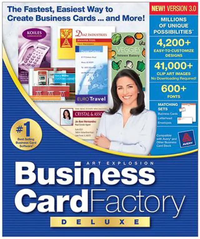 | Feature | With Art Explosion Business Card Factory Deluxe 3.0, you can create customized, professional business cards in just minutes. Guaranteed. This incredibly easy-to-use software allows you to choose from more than 4,200 customizable designs for virtually every type of business. Or, if you prefer, create your own designs using more than 41,000 clip art images including 750 logo elements. You can even create matching letterhead and envelopes for a consistent and professional company look. Once you have your design in place, you can print you professional-quality business cards on micro-perforated card stock available from Avery and other manufacturers. 4,200+ Easy-to-customize designs. 41,000+ Clip art images. 600+ Professional fonts. Create matching letterhead and envelopes. Create multiple user profiles so you can print cards for everyone is your company. Import logos, photos and other graphics in all popular file formats. Apply shadows, curves and other effects to text. Design up to 10 different cards on one sheet of paper. Print to any inkjet or laser printer. |