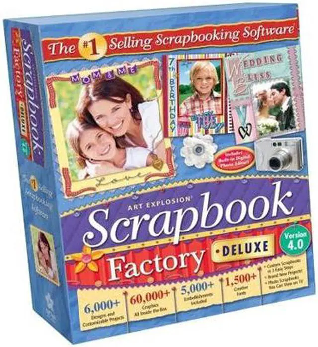 | Feature | Create memories to last a lifetime.6,000+ Exclusive Templates and Customizable Projects 60,000+ Beautiful Graphics All Inside the Box 5,000+ Photorealistic Embellishments Included 1,500+ Creative Fonts Preserve precious memories with version 4.0 of America's #1 best-selling scrapbook software. Scrapbook Factory Deluxe 4.0 offers the ultimate collection of 6,000+ exclusive templates as well as 60,000+ beautiful graphics and 5000+ photorealistic embellishments sure to capture the excitement of any occasion. You'll also be able to create spectacular CD Photo Scrapbooks you can watch on TV, and as an added bonus, personalized photo calendars! Scrapbook Factory Deluxe provides the ultimate collection of tools for creating one-of-a-kind keepsake projects. In this short video, you’ll explore our customizable project templates, photorealistic embellishments, graphics, creative fonts and photo editing capabilities. Plus, watch as a unique scrapbook page is created in 3 easy steps. |