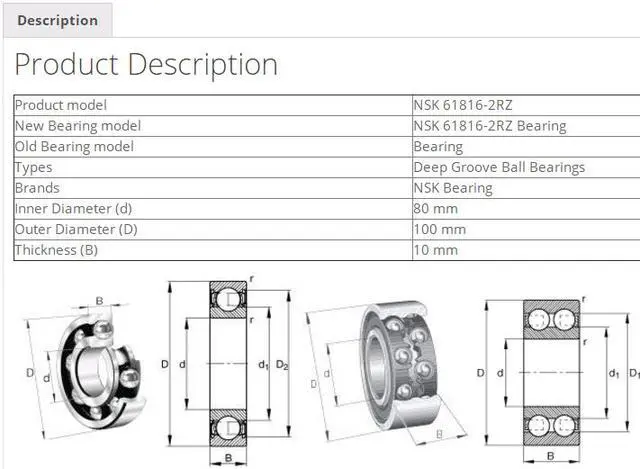 • NSK 61816 ZZ Deep Groove Ball Bearings 80x100x10mm