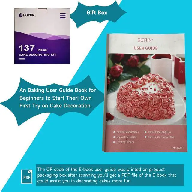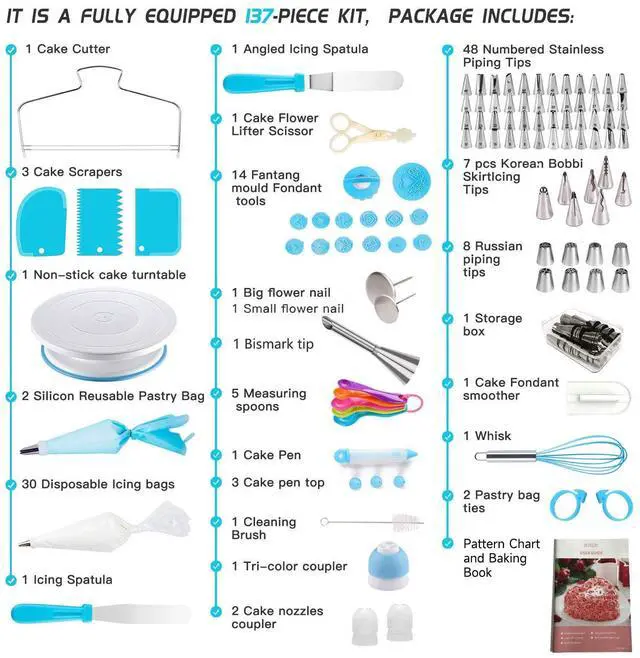 It is a fully equipped 138pcs cake decorating kit, Package Includes: 1 Cake Cutter : cake leveler strong and durable,curved packaging.Please read the guide chart carefully and straighten it before use. 3 Cake Scrapers : smooth surface, hang hole design. 1 Non-stick cake turntable : Can hold a cake up to 10-inches and can even accommodate a larger cake on a cake board, 2.7-inch tall has a non-slip edge. 2 Silicon Reusable Pastry Bag:Use it, wash it and it is ready to use again. 30 Disposable Icing bags:Dont like washing icing bags? No worries, 50 Disposable Icing bags are in set. Use & through away. 1 Icing Spatula: Use it to shift and spread icing evenly. 1 Angled Icing Spatula. 1 Cake Flower Lifter Scissor : Easily transfers flowers from nail to cake without damage. 14 Fantang mould Fondant tools . 1 Big flower nail : Flower nails are a popular way to create flowers for wedding cakes and pastries. 1 Small flower nail. 5 Measuring spoons: with a quarter tsp., half a tsp., one tsp., half a tbsp. and one tbsp, with millilitre (ml) equivalents. 1 Cake Pen: Fill them with icing, apply even pressure and start decorating like normal pen. 3 Cake pen top. 1 Cleaning Brush :Dont spoil your hands cleaning tips. Use Cleaning Brush to remove icing from narrow tops. 1 Color coupler. 2 Cake piping nozzles coupler 48 Stainless Icing Tips. 7 Korean Bobbi Skirt Icing Tips : Create beautiful icing swirls,rosettes,flowers, bobbi skirt and other. 8 Russian piping tips :Pipe beautiful flower using these tips with just a little squeeze. 1 Bismarck nozzle. 1 Cake Decorating Tools box : For storage Stainless Icing Tips. 1 Cake Fondant smoother. 1 Whisk : Polished stainless steel wires. 2 Pastry bag ties. 1 Printed Pattern Chart. 1 Ebook User Guide.