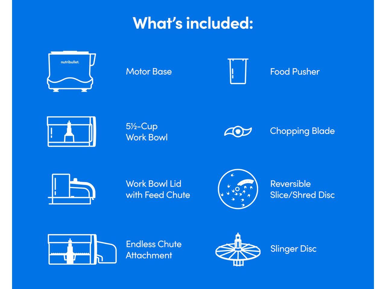- Includes: 5 1/2 Cup Work Bowl, Chopping Blade, Endless Chute, Lid w/ Feed tube, Medium Pusher, Reversible Slicing / Shredding Disc, Slinger Disc