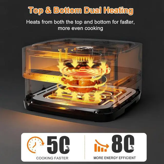 ? Yes. The dual heating air fryer uses top and bottom heating elements with 360° hot air circulation for faster, more even cooking with less flipping, delivering crispy and golden results.