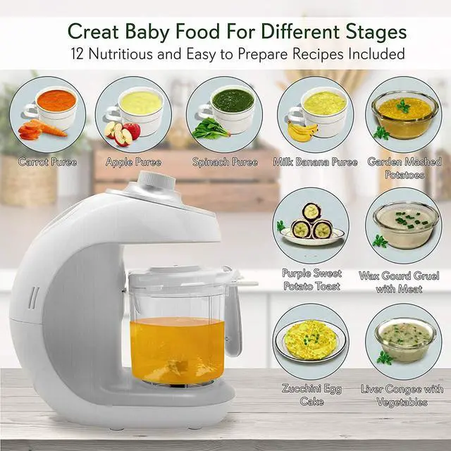 ELEGANT MODERN DESIGN: Make homemade baby food in just 10 minutes. This machine has a simple electric plug-in design and hassle-free control settings in an elegant modern style that will complement any kitchen countertop or tabletop design