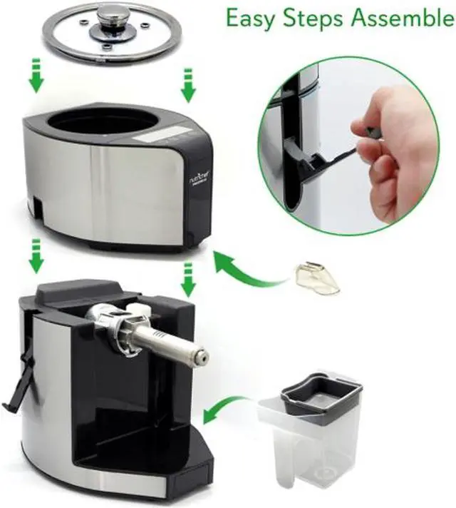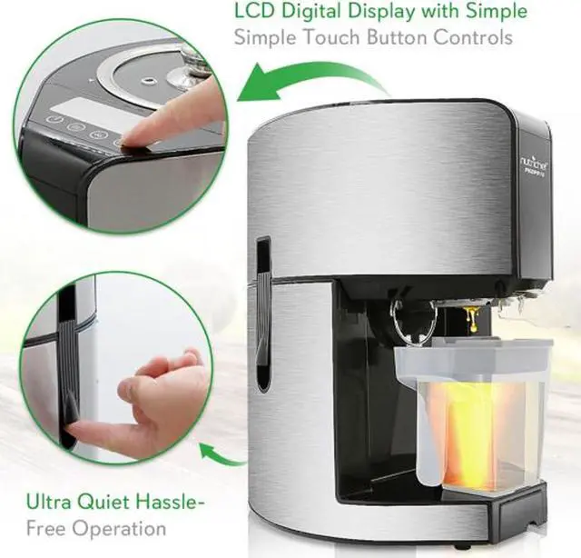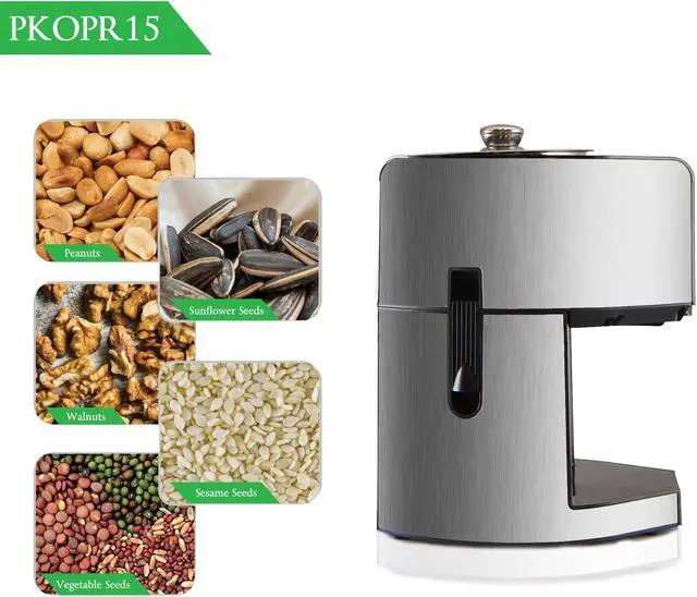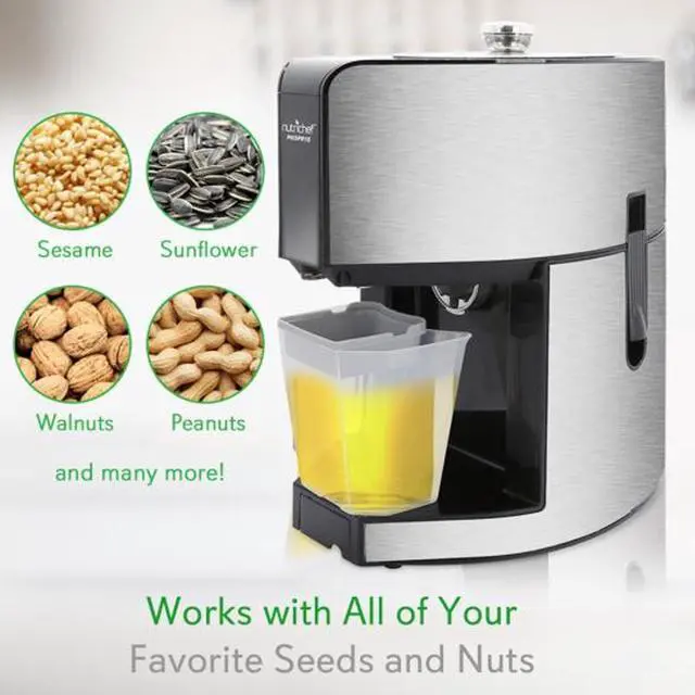 | Features | Save Money with Smart Food Prep Effectively Squeezes and Extracts Oils Extraction Process Retains the Food's Nutritional Health Benefits Heat & Pressing Power: Create Organic & Homemade Alternatives Processed Food Waste is Expelled into Collection Container Food Content Creation Retains Healthy Vitamins and Minerals Can be Used for Hot Press or Cold Press Extracting Generates Heat to Aid in the Extraction Process Versatile Wide Variety Food Compatibility Used with Naturally Oil-Rich Nuts, Seeds, Kernels, Tea Seeds, etc. (Peanuts, Walnuts, Sesame, Sunflower & Vegetable Seeds) Built-in Filter Catches Unwanted Food Particles LCD Digital Display with Simple Touch Button Controls (4) Selectable Processing Modes: Well Done, Medium, Mild, Raw Ultra Quiet Hassle-Free Operation Easy-to-Clean Stain Resistant Construction Safety Automatic Power Off Function |