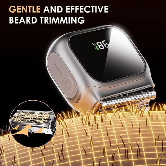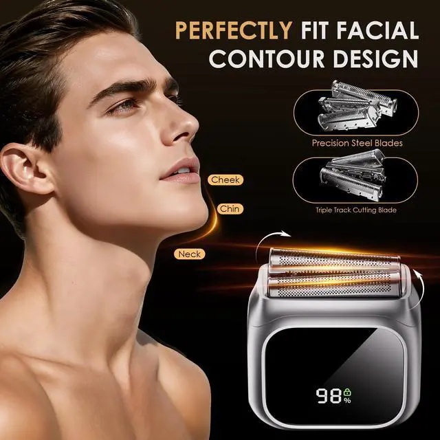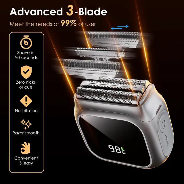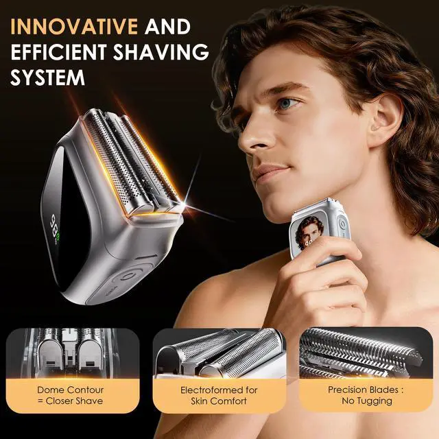 Triple-Blade SkinGuard System: The 0.05mm ultra-thin steel foil glides like butter, effortlessly hugging every curve of your face for a smooth, irritation-free shave.Precision-engineered titanium alloy blades with smart sensor technology eliminate hair pulling for good.