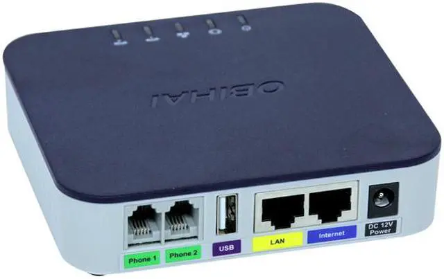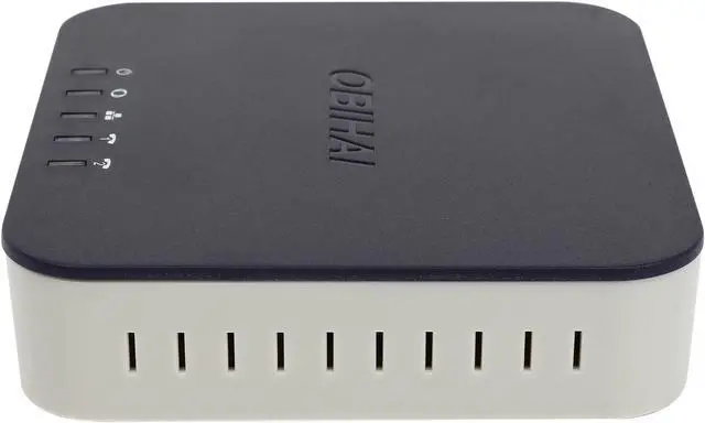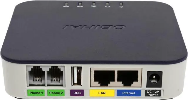 | Ports | Internet (WAN): 1 x 10 / 100BaseT Ethernet Port (802.3) LAN: 1 x 10 / 100BaseT Ethernet Port (802.3) Phone (FXS): 2 x RJ-11 FXS Analog Phone Ports USB: USB 2.0 (For use with OBiWiFi, ObiBT and Storage Devices) |