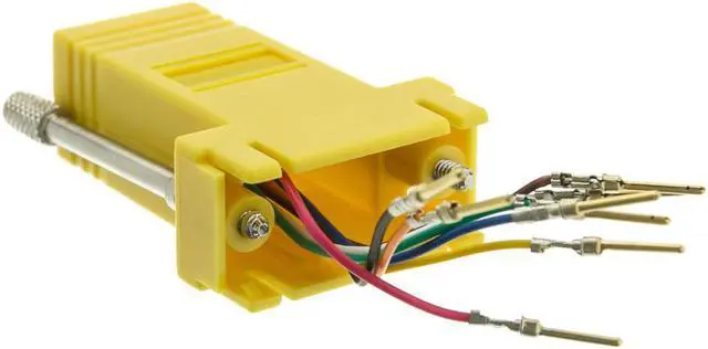 A modular adapter is typically used to traverse log distances over a 8 conductor phone line / network cable.Converts: Converts back and forth between DB9 Male Plug and RJ45 Female Port.Connection: DB9 Male Plug. Connection: RJ45 Female Port.Color: Yellow. Weight: 0.10 lbs.Warranty: Lifetime.
