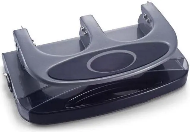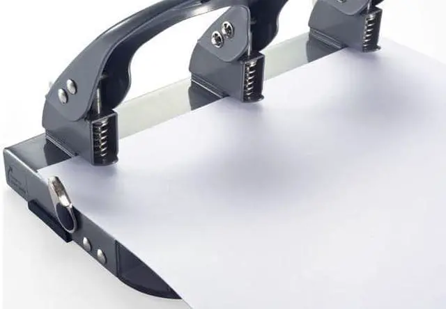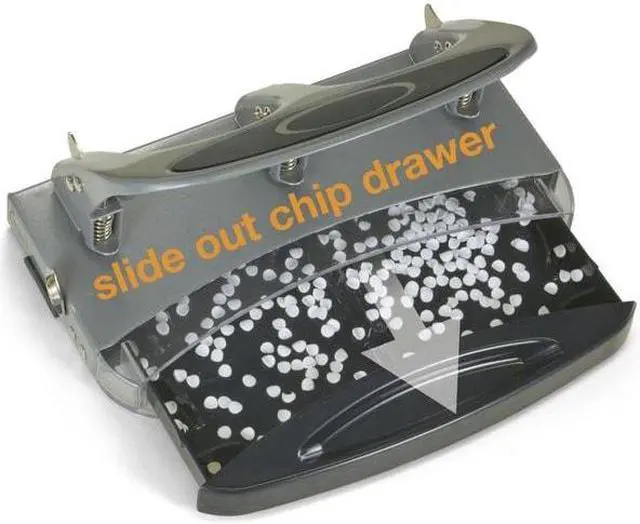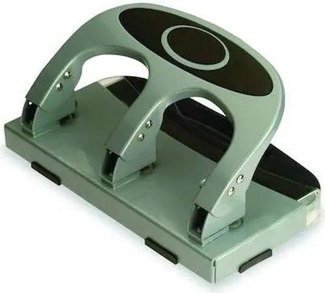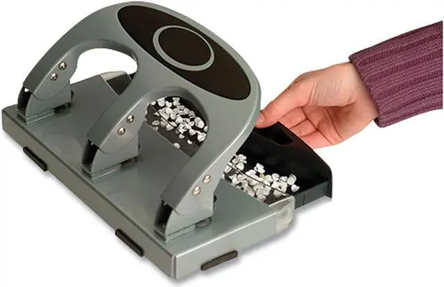 Manual Paper Hole Punch, Sheet Capacity 45, Hole Dia. 1/4 in, Color Silver, Material Metal, Features Built-In Guide, Padded Handle, Chip Tray with Window. This item has been restricted from sale in the following state (s): []