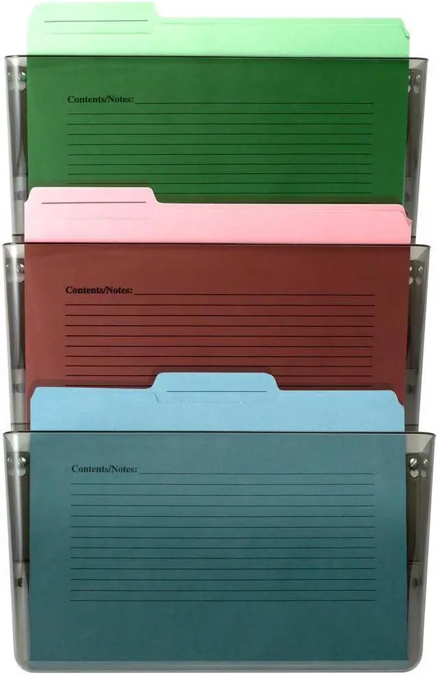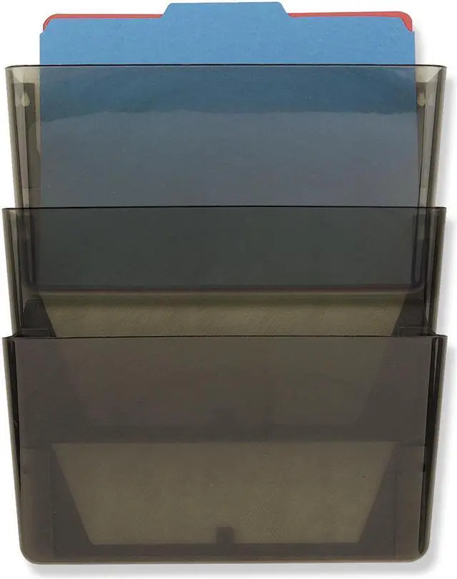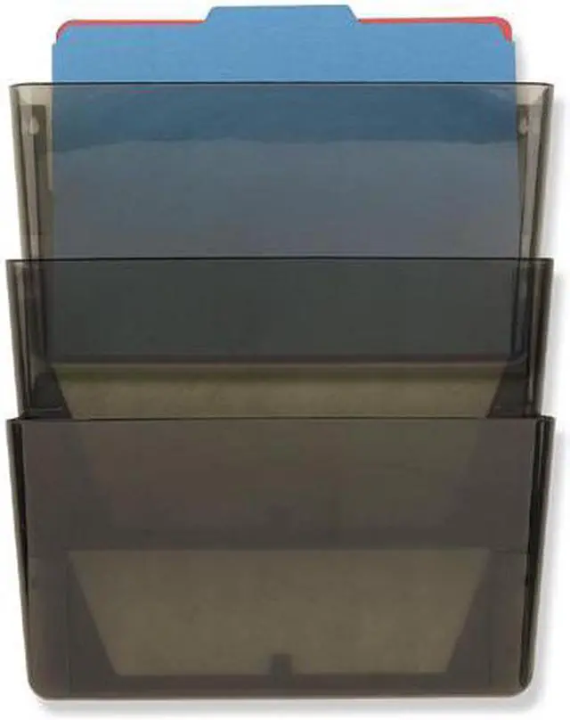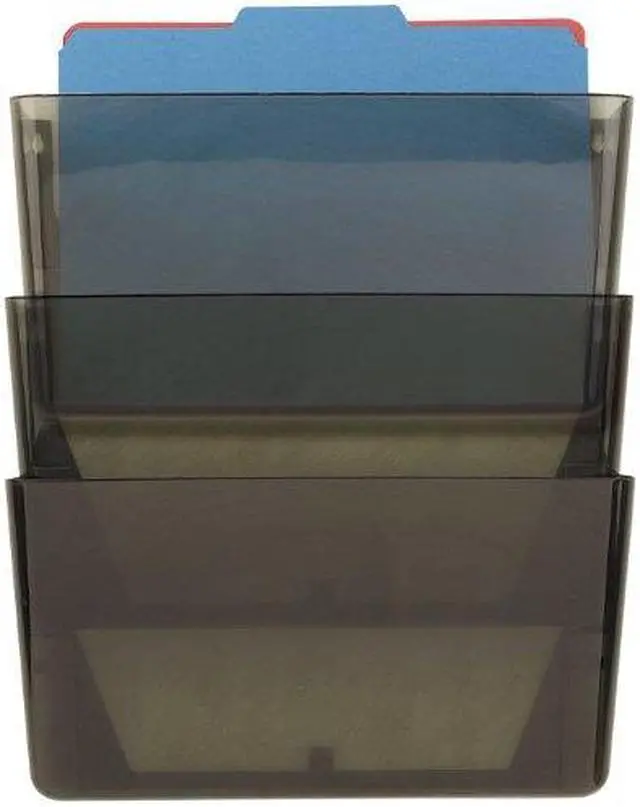 Wall File, Material Plastic, Color Smoke, Height 7 in, Width 13 in, Depth 4 1/8 in, Number of Compartments 3, Includes Hardware and Tape, Package Quantity 3