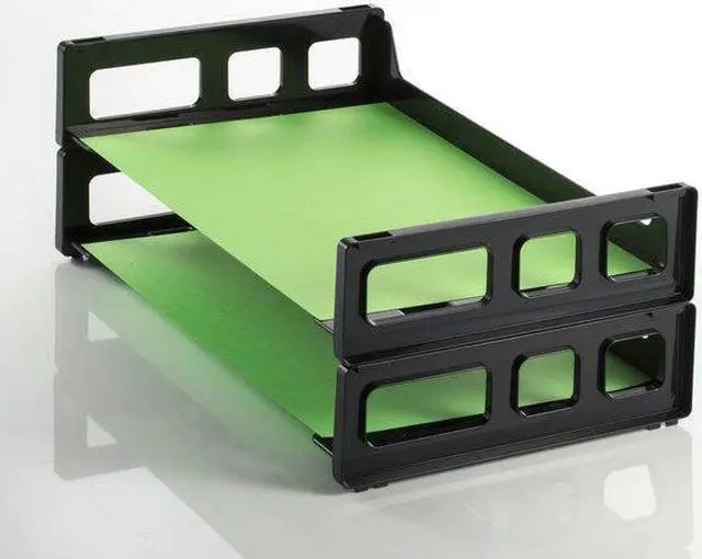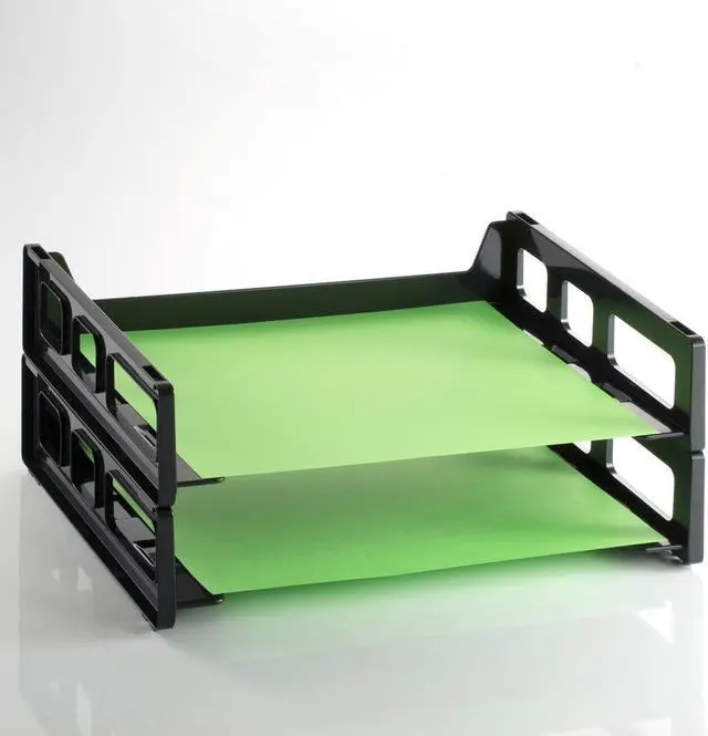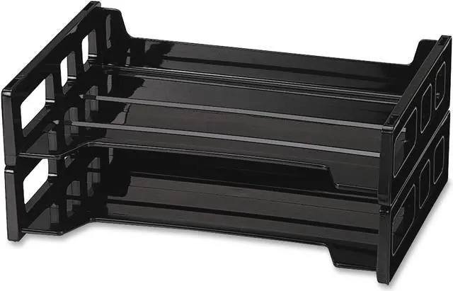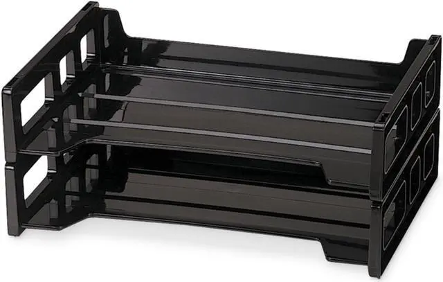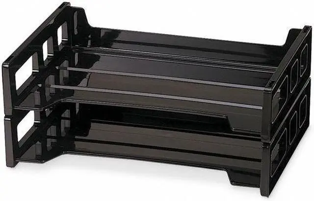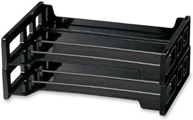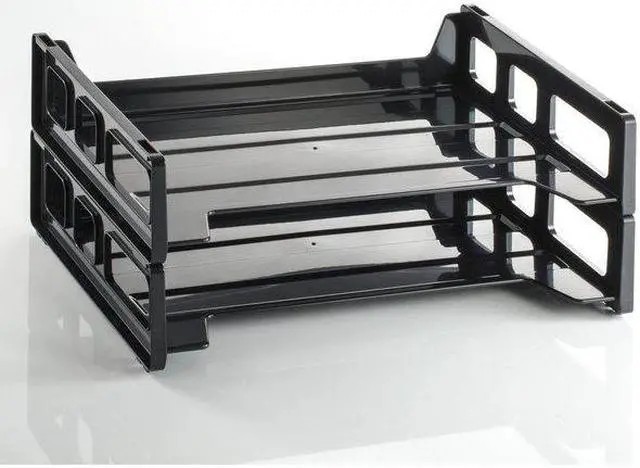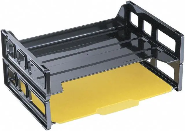 Side-loading trays stack securely to form a convenient method of desktop organization. Durable injection-molded plastic design features a ribbed bottom to prevent paper from sticking. Each tray stacks with most other desk tray models. Built-in handles make trays easily portable.