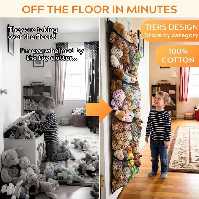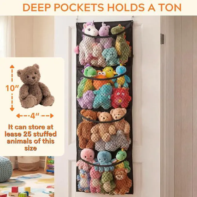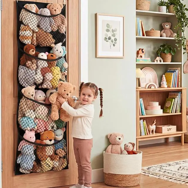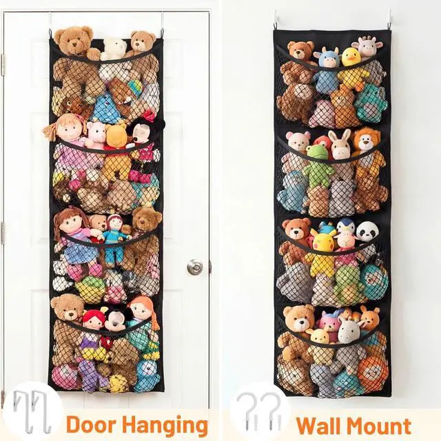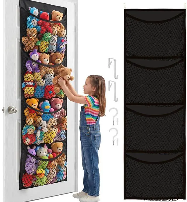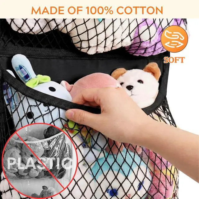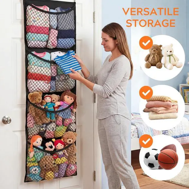 Introducing our innovative Over The Door Stuffed Animal Storage solution, designed to declutter your nursery, bedroom, or kids' room with ease and style. Crafted from high-quality cotton material, this toy organizer offers a durable and eco-friendly storage solution for plush toys, baby supplies, and stuffed animals. With four large pockets, this hanging door organizer provides ample space to neatly store and organize your child's favorite toys and essentials. The spacious design ensures that everything is kept in place, making it easy for your little one to find their toys when they need them. The convenient over-the-door design allows for easy installation without the need for tools. Simply hang the organizer over any standard door and adjust the straps for a secure fit. This versatile storage solution is perfect for small spaces and can be easily moved from room to room as needed. Not only does our Stuffed Animal Storage Organizer help keep your child's room tidy, but it also adds a touch of charm to any space with its stylish and practical design. In addition to its storage capabilities, our organizer also promotes organization and independence in children. By providing a designated space for their toys, children can learn the importance of tidying up and taking responsibility for their belongings from a young age. Whether you're a parent looking to create a clutter-free environment for your child or a caregiver in need of a convenient storage solution, our Over The Door Stuffed Animal Storage Organizer is the perfect choice. Order yours today and enjoy a cleaner, more organized living space for you and your family.