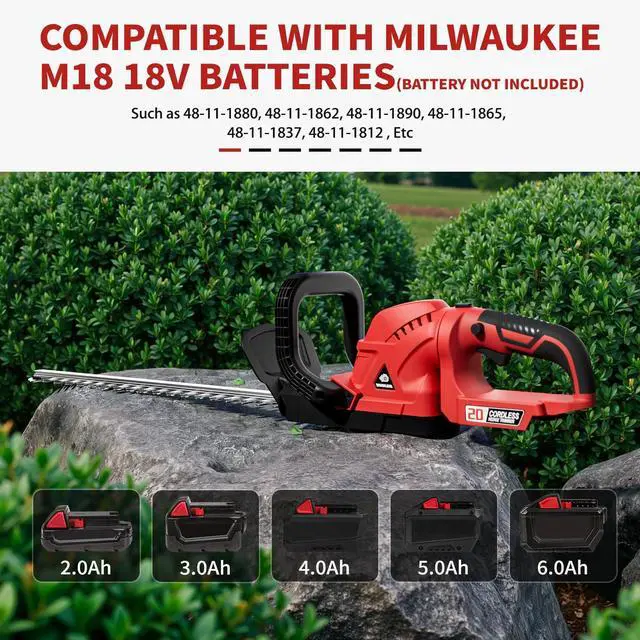 Battery-Powered Hedge Trimmer:(Bare tool, no battery or charger included)This cordless hedge trimmer is battery-powered and compatible with Milwaukee M18 18V batteries, such as M18B2, M18B3, M18B4, M18B5, M18HB3, M18HB6, M18HB8, M18HB12.