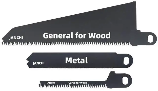 JANCHI 3 piece replacement blade set that includes a general purpose blade and a curved blade and a metal cutting blade.