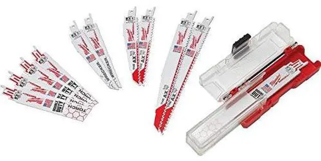 The Milwaukee 12 piece Sawzall blade set features an assortment of our most popular demolition blades for a broad range of professional applications. Milwaukee demolition blades are thicker for maximum durability and taller for straighter cuts. The set features The Ax for cutting nail embedded wood, The Wrecker for general purpose demolition cutting, and The Torch for metal cutting. The set also includes an innovative job site durable case for convenient blade storage.
