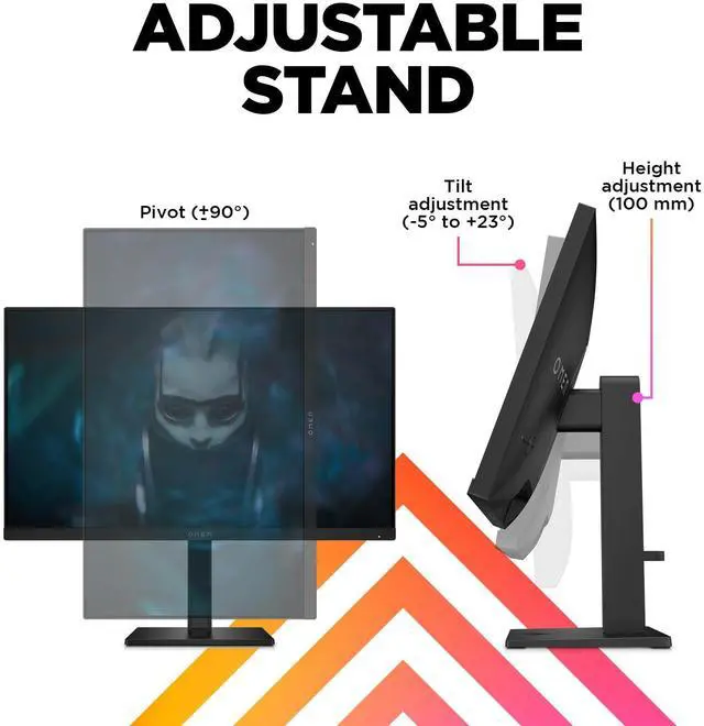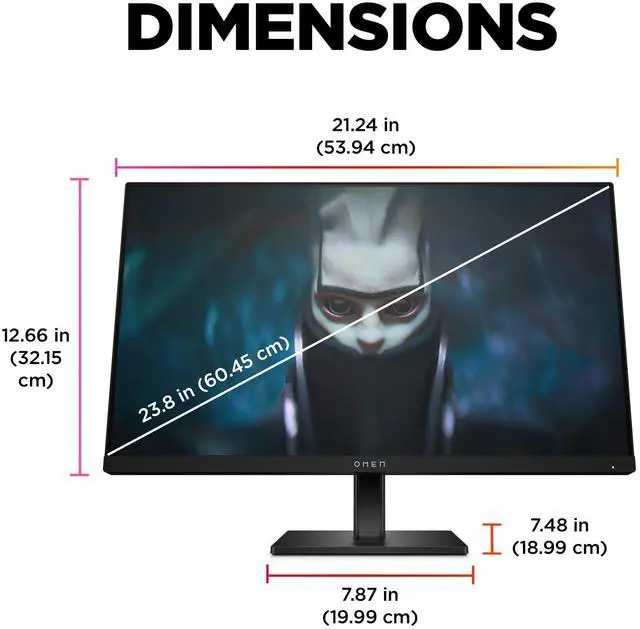 OverviewReach new possibilities with the OMEN by HP 23.8 -inch FHD 165Hz Gaming Monitor. Quick performance and vibrant color let you get lost in the games you love most, while the sleek design functions to look and feel great on your desk. Height adjustable; Pivot; TiltWhat's in the box? Monitor; DisplayPort cable; Warranty card; Quick Setup Poster; AC power cordDisclaimers All performance specifications represent the typical specifications provided by HP's component manufacturers; actual performance may vary, either higher or lower. Requires a monitor and AMD Radeon graphics, both with FreeSync Premium support.