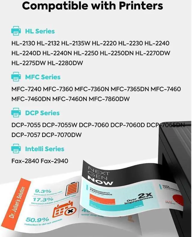Reliable Compatibility: Laser Printer HL-2220 HL-2230 HL-2240 HL-2240D HL-2242 HL-2250 HL-2270DW HL-2280DW; MFC-7240 MFC-7360N MFC-7460DN MFC-7470 MFC-7860DW; DCP-7060D DCP-7065DN DCP-7070; IntelliFax-2840 IntelliFax-2845 IntelliFax-2940 FAX-2950 FAX-2990.
